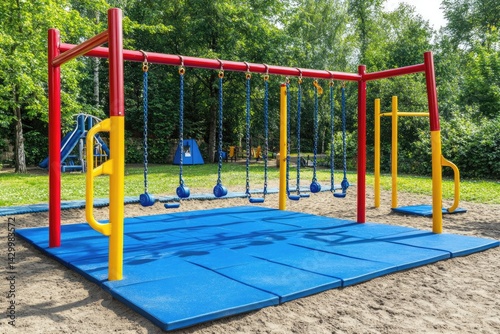 playground, swing, children, park, safety, equipment, children, fun, exercise, recreation, play, activity, game, metal, red, yellow, blue, swingset, recreational, summer, sunny, tree, sand, nature, learning, development, physical, health, playground, childhood, happy, outdoors, playtime