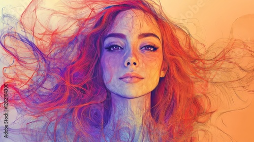colourful, portrait, woman, bright, flowing, hair, artistic, vibrant, face, dynamic, digital, abstract, young, expressive, painting, glowing, engaging, detailed, female, beauty, person, model, fashion, art, background, eye, make-up, attractive, style, design