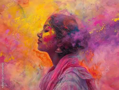 holi, celebrate, woman, portrait, colourful, vibrant, art, painting, emotion, beauty, profile, creative, abstract, expression, artistic, face, coiffure, earring, pink, yellow, purple, orange, background, modern, female, serene, joyful, contemporary, dreamy, soft, emotional, high-coloured, bright, fantasy, imaginative