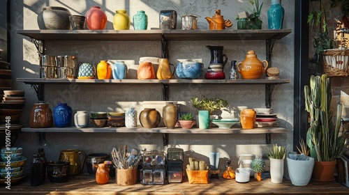 pottery, collection, colourful, ceramic, shelf, display, rustic, artistic, decorative, hand-made, home, interior, cosy, craft, artisan, vibrant, clay