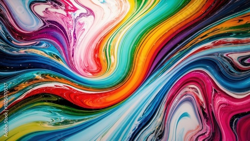 Colorful psychedelic flowing liquid wet paint splashes abstract background. Artistic trippy vibrant colors rainbow paint flows. Bright wallpaper art illustration header concept.