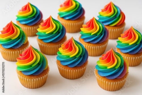 Colorful rainbow frosted cupcakes arranged artistically on pristine white background for bakery marketing