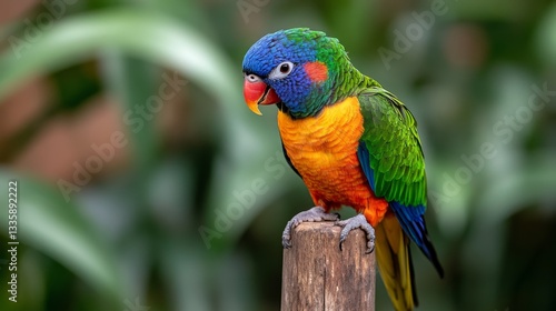 Colorful rainbow lorikeet perched on wooden post in lush greenery