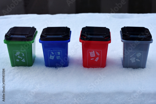 Colorful recycling toy boxes standing in snow, plastic classification trash cans as children's educational toys. Ecology and next generation concept