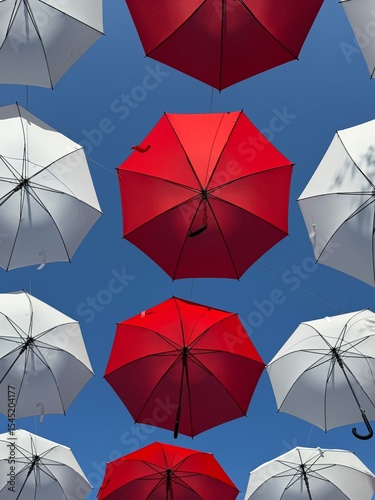 colorful red and white umbrellas with blue sky background