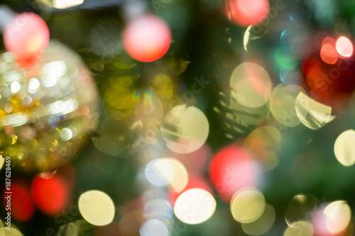 Colorful Red, Yellow and Green Christmas Tree Bokeh background of de focused glittering lights,