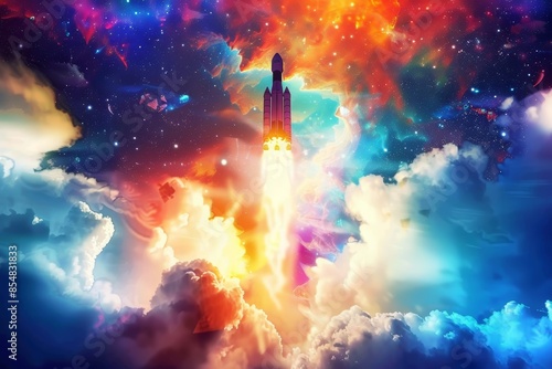 Colorful rocket launch into outer space amidst a vibrant, dreamy sky with clouds and cosmic stars, symbolizing exploration and adventure.