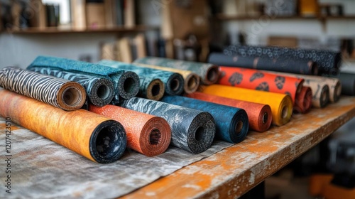 Colorful rolls of fabric displayed in a textile workshop showcasing various patterns and textures in soft lighting