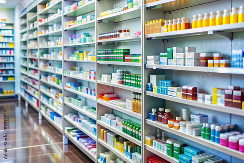 Colorful rows of medication bottles and packets line shelves in a tidy pharmacy, awaiting customers, with a blurred background and soft, natural lighting.