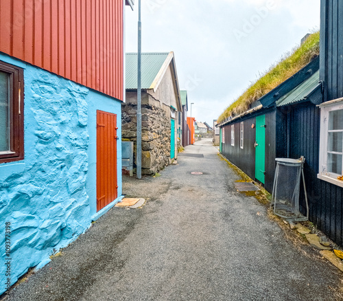 Colorful Scandinavian style architecture lines a narrow alleyway in Nólsoy, Faroe Islands. Beautiful grass rooftops, as typically seen in this area.
