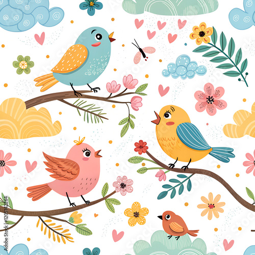 bird, animal, cartoon, illustration, bird, nature, tree branch, tree, love, pattern, spring, design, flower, seamless, cute, art, card, set, colourful, drawing, wing, wallpaper, season, feather