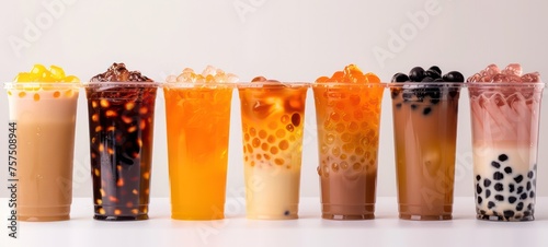 Colorful selection of milky fruit flavored bubble tea arranged in a line on white background