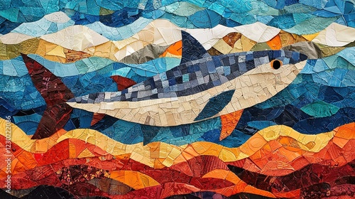 Colorful shark mosaic swimming in ocean waves art piece underwater vibrant environment artistic perspective
