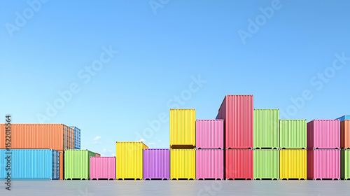 shipping, cargo, port, industrial, logistic, transportation, colourful, bright, vibrant, stacked, many-coloured, blue skies, horizontal, background, city, freight, import, export, modern, design, digital, illustration, graphic, three-dimensional, render, box, perspective, geometric, architecture, urban, warehouse, dock, logistic, commercial, trade, delivery, international trade