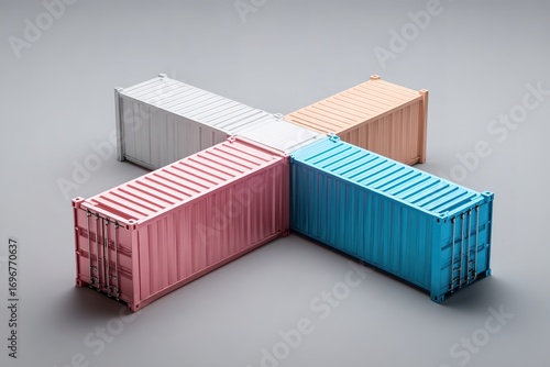 Colorful shipping containers arranged in a cross pattern on a light background in an industrial setting