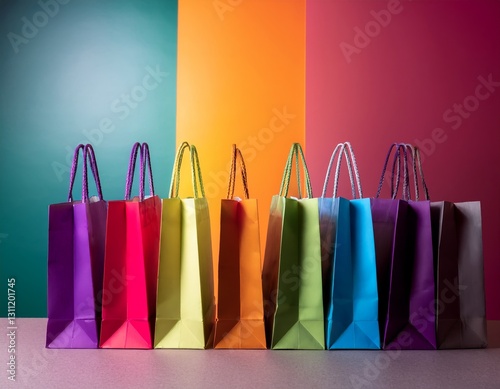 Colorful shopping bags arranged against colored background