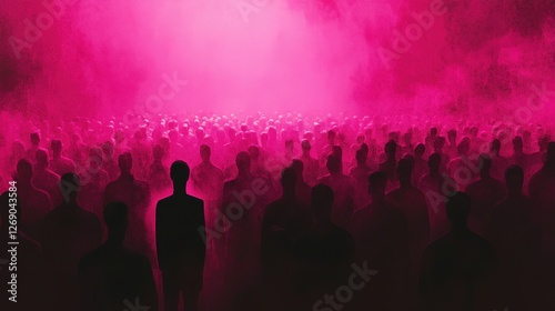 Colorful silhouette pf person standing in monochrome crowd of different people,surreal unique and different concept,loneliness in society,shadow,freedom,Love,be yourself,Stand out from the crowd.