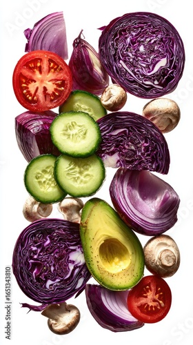 vegetable, sliced, red, purple, green, onion, tomatoes, cucumber, cabbage, mushroom, avocado, food, healthy, fresh, cut, slice, raw, ingredient, diet, nourishment, produce, organic, receipe, cooking, composition, arrangement, vertical, isolated, white, background, closeup, bright, freshness, vitamin, mineral, nutrient, tasty, delicious, colourful, natural, preparation, cookery