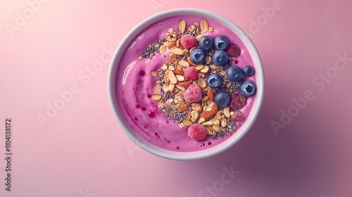 Colorful smoothie bowl topped with blueberries, nuts, and seeds, brain-boosting breakfast, vibrant and healthy meal.