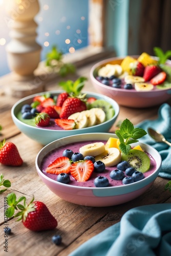 Colorful smoothie bowls with fresh fruits on a wooden table in a cozy setting