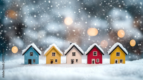 Colorful snow-covered houses set against a wintery background with falling snowflakes.