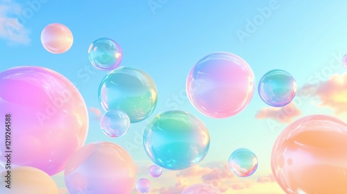 Colorful soap bubbles floating in a bright sky at sunset