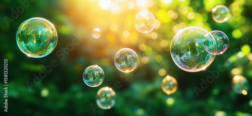 Colorful soap bubbles floating in sunlight with blurred green background.