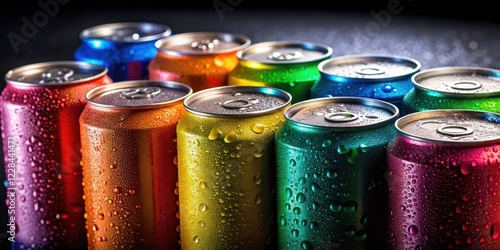 Colorful Soda Cans with Condensation on Dark Background, condensation
