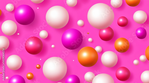 Colorful spheres in various sizes and shades float against vibrant pink background, creating playful and dynamic abstract composition that evokes sense of joy and creativity