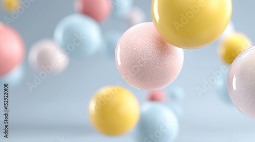 Colorful spheres in various sizes float gracefully against a soft blue background, creating a whimsical and vibrant atmosphere, perfect for playful design concepts and creative projects
