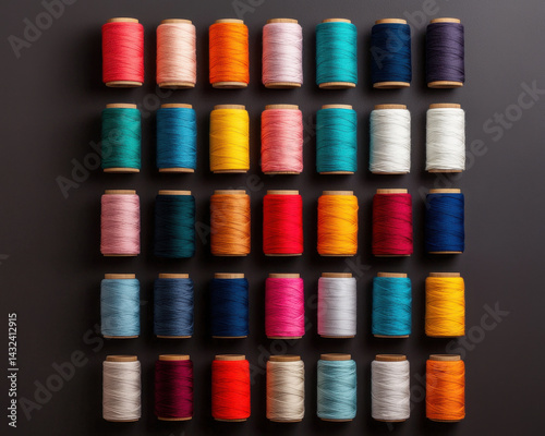 Colorful spools of thread arranged in grid display various shades and sizes, showcasing vibrant palette perfect for sewing and crafting projects. visual appeal evokes creativity and inspiration