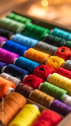 thread, spool, colourful, vibrant, embroidery, sewing, needlecraft, threaded, material, collection, colours, many-coloured, sewing kit, craft, box, wooden, storage, closeup, detail, bright, organised, pattern, artistic, supply, multi, hue, design, stitching, craft, fabric
