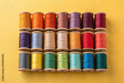 Colorful spools of thread on yellow background