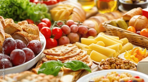 food, ingredient, fresh, healthy, meal, preparation, vegetable, fruit, pasta, bread, cracker, tomatoes, cheese, nut, grain, basil, culinary, kitchen, dining, picnic, colourful, epicure, organic, agriculture, harvest, nourishment, snack, variety, wholesome, cookery, rich, table, buffet, receipe, natural, simple, favor, delicious, alimentary, produce, cooking, presentation, serving