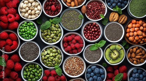 Colorful Spread of Superfoods, Fruits, Nuts, and Seeds – A Celebration of Healthy, Nutrient-Rich Eating