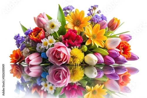 Colorful spring flowers bouquet on a white background, reflected