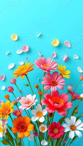 Colorful spring flowers on blue background. Spring is here concept with exploding flowers and petals. 3D Rendering, 3D Illustration, magazine photoshoot, with white tones