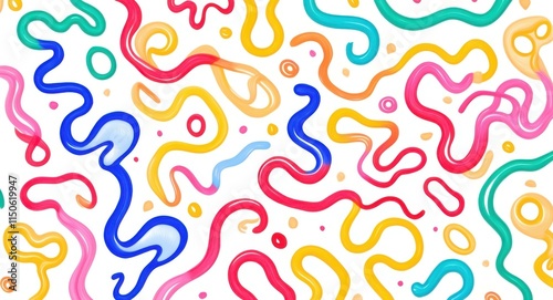 Colorful squiggly lines, abstract pattern, vibrant colors, playful shapes, wavy curves, dynamic composition, minimalist design, graphic art, seamless background, cheerful aesthetic, primary colors, fl
