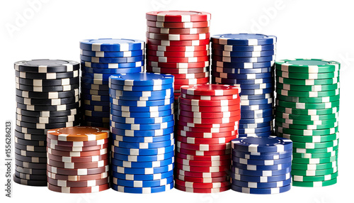Colorful stacks of poker chips arranged by height on a transparent background, showcasing different colors and sizes of gaming tokens used in card games or casinos, capturing the essence of gambling.