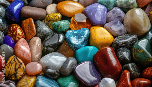 Colorful stones in various shapes, sizes, and colors create vibrant and captivating display. assortment showcases beauty of natures gemstones, evoking sense of wonder and tranquility