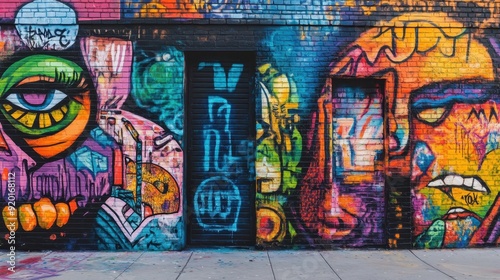 Colorful Street Art Graffiti on Brick Wall with Abstract Designs and Faces