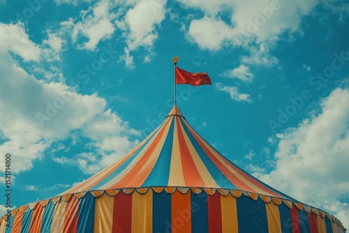 Colorful striped circus tent with a flag on top, Classic Carnival Festival Attraction