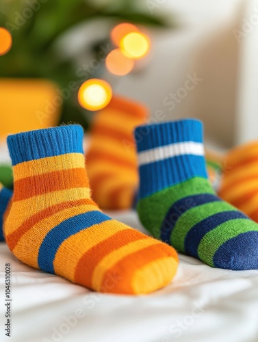Colorful striped socks on a bed with soft lighting and a cozy atmosphere.