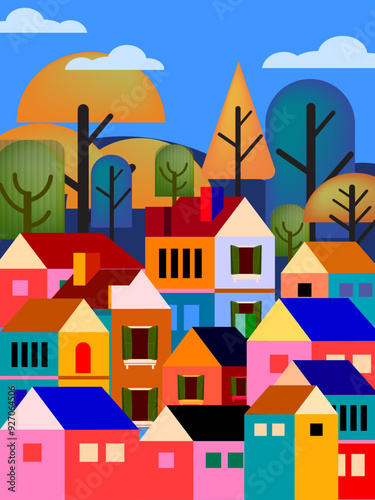 Colorful summer season in small town, tiny village view, residental houses vector illustration background. Beautiful green neighborhood, real estate development.