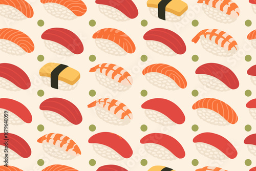 Colorful sushi pattern featuring various types of sushi on a light background for culinary art designs
