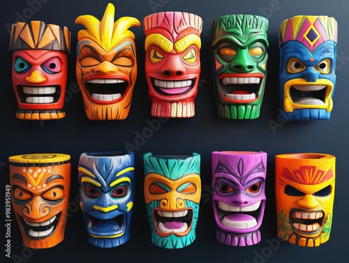 tiki, mask, colourful, black, background, island, hawaiian, tribal, art, decorative, cultural, exotic, tropical, ethnic, party, celebration, festival
