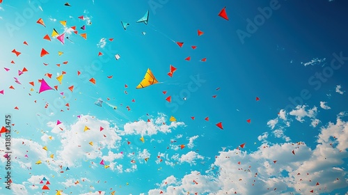 Colorful Triangular Kites Flying in a Bright Blue Sky with Fluffy White Clouds