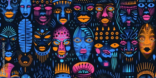 Colorful tribal mask pattern with vibrant hues of blue, pink, and orange on a dark background. Ideal for cultural artwork, fabric prints, or digital designs.