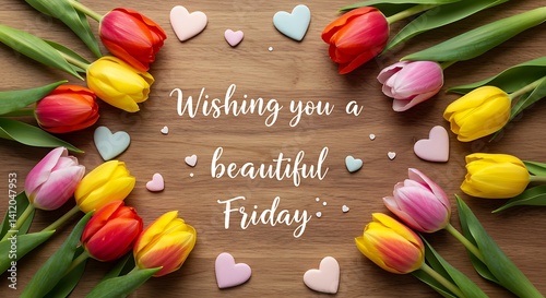 Colorful Tulips and Hearts on Wooden Background Wishing a Beautiful Friday