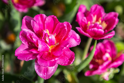 Colorful tulips on a windy spring day
